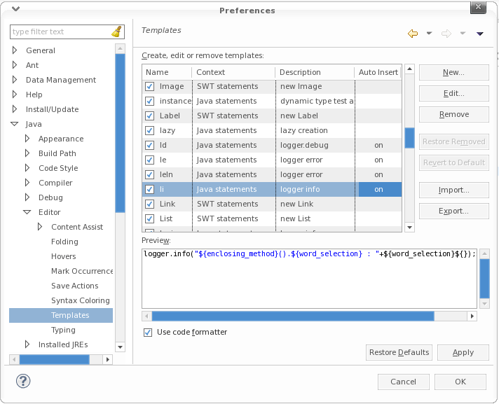 - Java > Editor > Templates